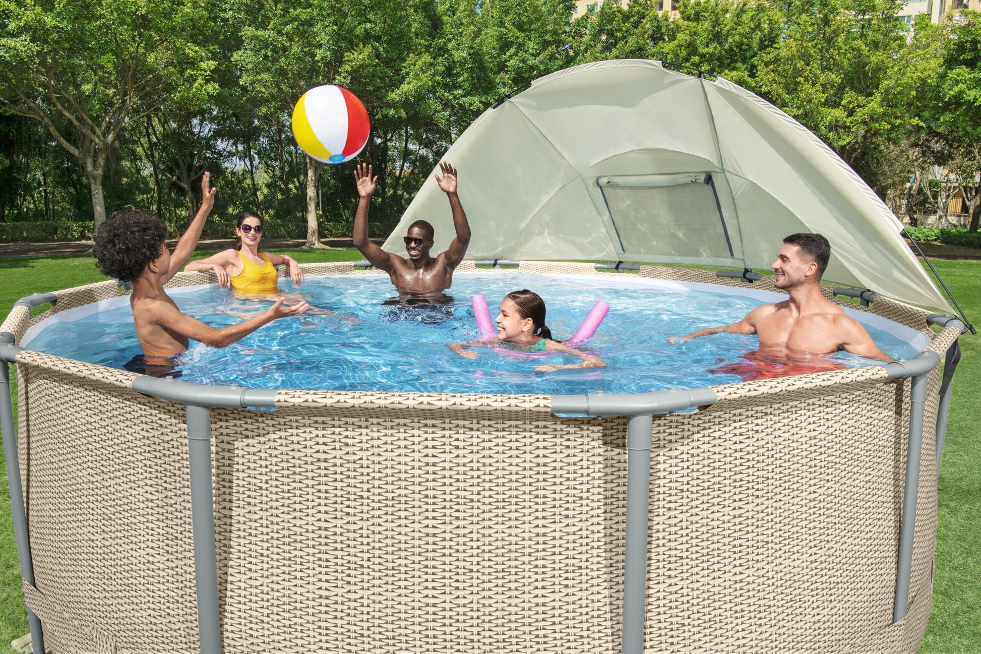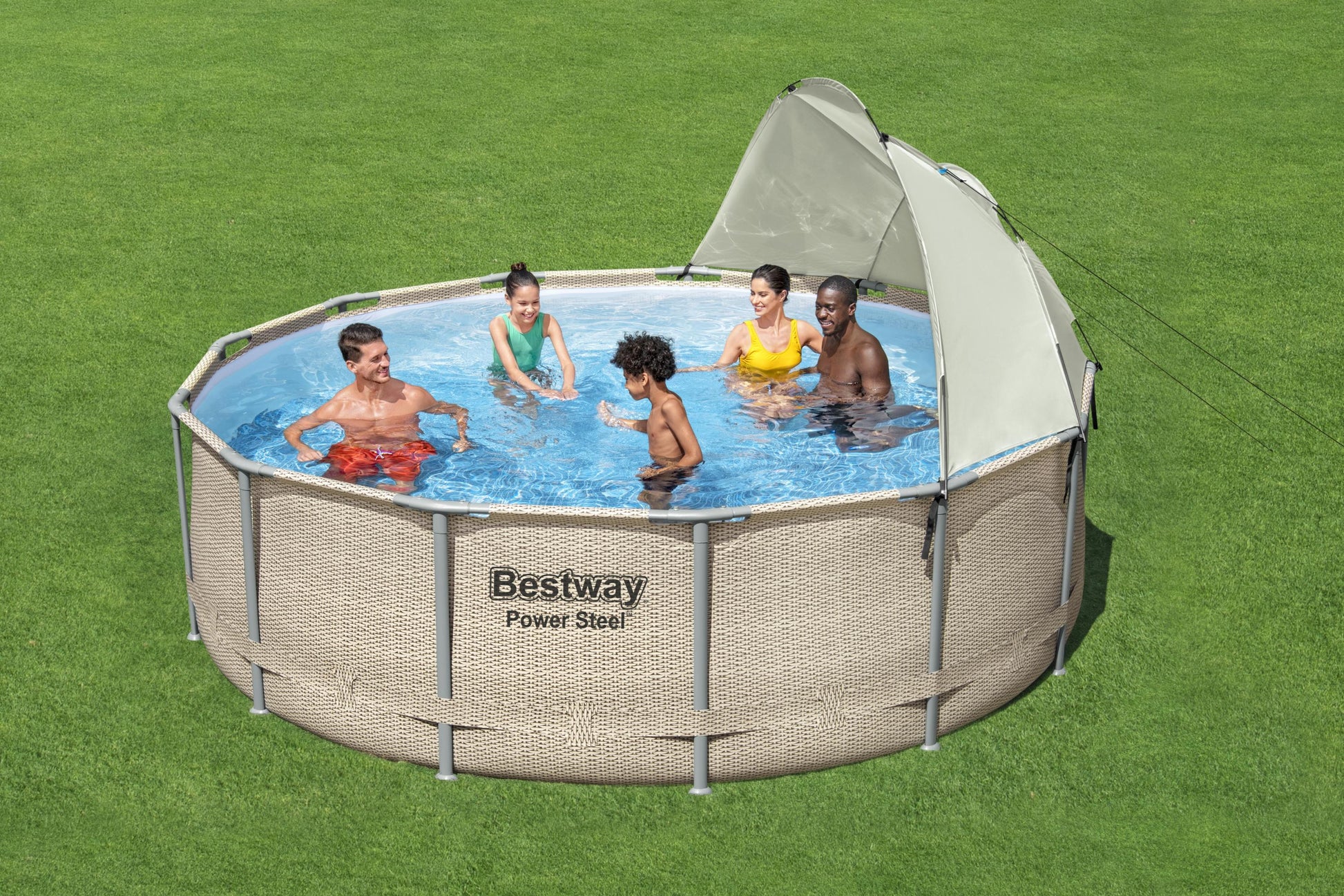 - El toldo de una sola capa se puede colocar y quitar fácilmente del marco de la piscina.